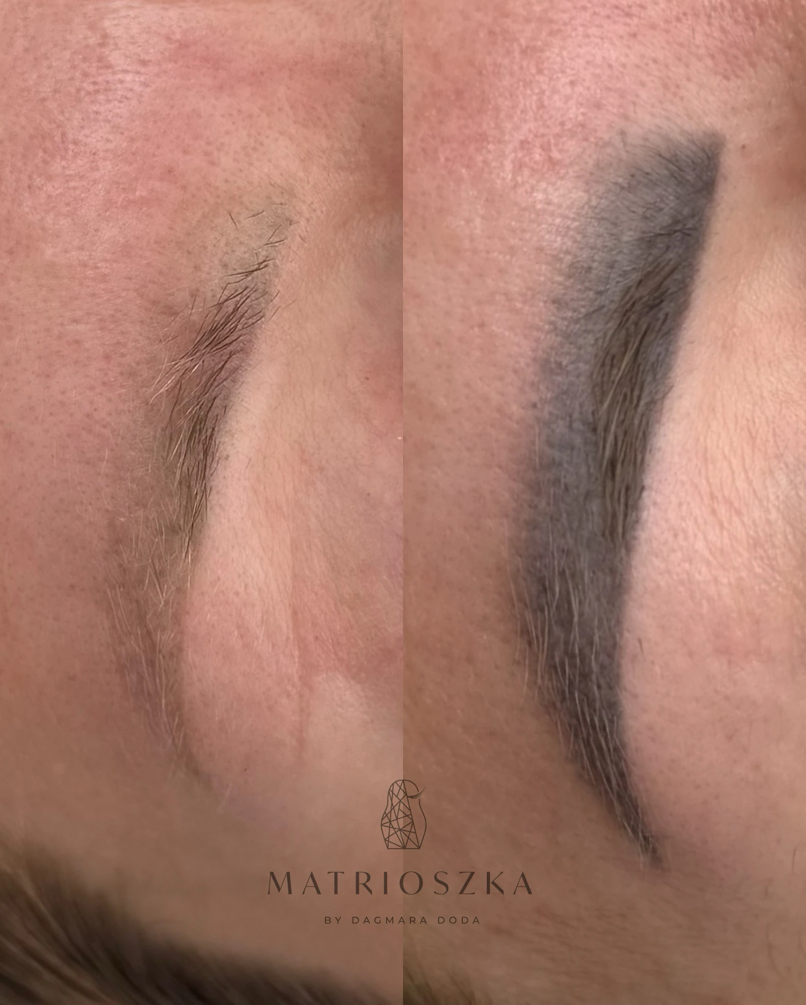 Efekt: Wyrównanie i zmiękczenie blizny, znaczne rozjaśnienie pigmentu, poprawa kształtu obszaru, przygotowanie skóry do nowego, perfekcyjnego PMU.